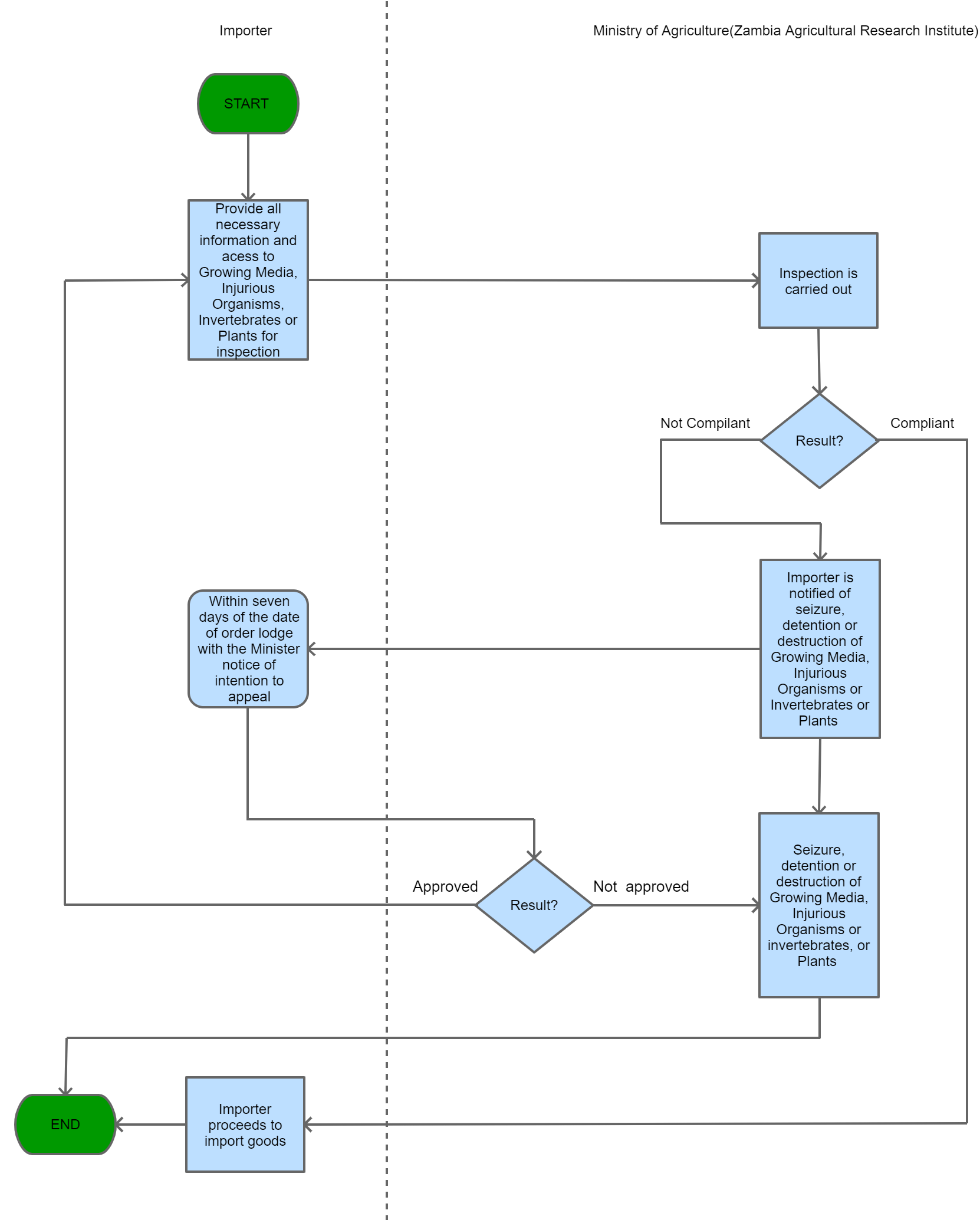 | Importation Inspection requirement for Growing Media, Injurious Organisms, Invertebrates or Plants | Inspection Requirement | An importer of growing media, injurious organisms, invertebrates or plants and his servants and agents shall afford an inspector access thereto and shall give such information and provide such labour and facilities as the inspector may require for the purposes of carrying out any inspection, sorting, disinfection, fumigation or treatment of the growing media, injurious organisms, invertebrates or plants. | All growing media, injurious organisms, invertebrates or plants being imported into Zambia are required to undergo inspection, sorting, disinfection, fumigation or treatment. | Plant Pests and Diseases Act, 1959 | 09-09-9999 | Good |
