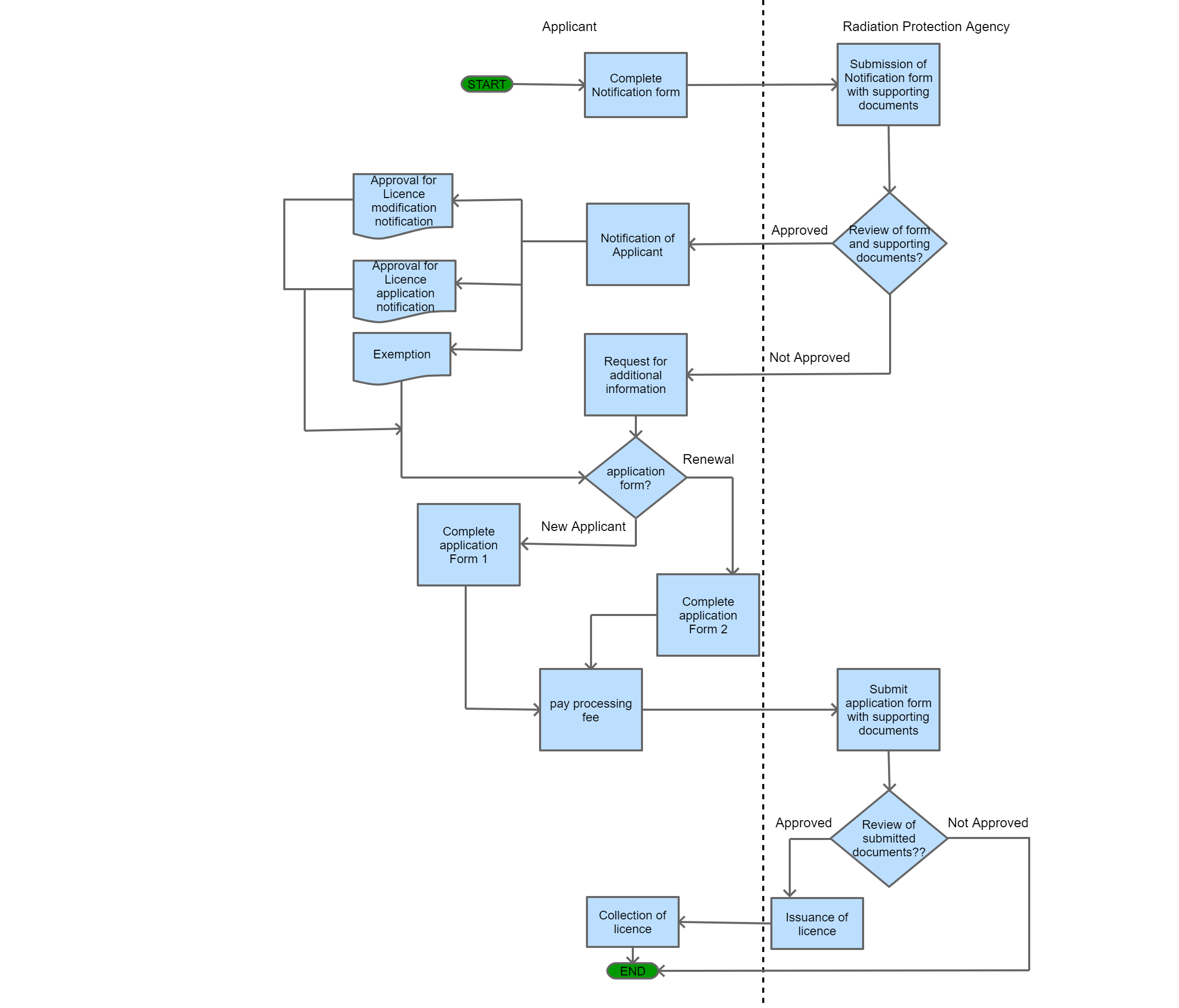 The authority reviews application and applicant notified of application status. If approved, the applicant proceeds to complete the application form 1 for a new applicant and Form 2 for the renewal of the licence. |